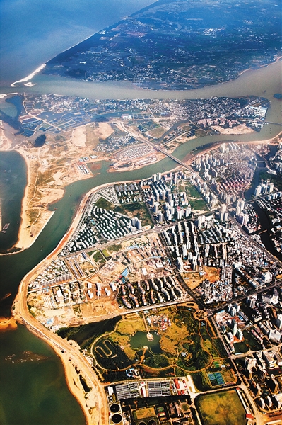 鸟瞰海口新埠岛与白沙门海岸线一带美丽风光。 本报记者 李幸璜 摄