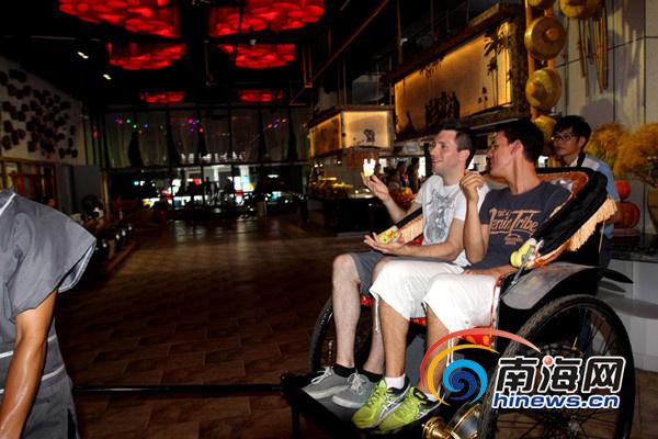 国际版《城市之间》参赛代表体验人力车(南海网记者陈望摄) 南海网海口6月20日消息(南海网记者 陈望)琼剧表演、老爸茶、品尝海南咖啡......6月20日下午,2015年国际版《城市之间》参赛代表及媒体等几十人参观海口骑楼老街,不仅感受骑楼老街的那份“古韵”,还可以了解传统的椰城文化。 据了解,《城市之间》起源于法国,是以群众为基础,体育为平台,城市为卖点,来宣传城市的一档巨型游戏类节目,被称为“百姓运动会”。《城市之间》把体育看成是塑造大众精神健康的体现,它所表现出来的乐观、健康、幽默与拼搏感染着现场及电视机前的观众。自2005年在中国首次开播以来引起持续轰动与反响,并一直拥有高收视率与高度关注。 2015年,享有盛誉的国际版《城市之间》首次落户中国,而将落地城市选在海口。节目录制期间,中国、法国、匈牙利、阿尔及利亚、哈萨克斯坦五个国家的参赛选手将相聚海口,斗智斗勇,全倾全力,在游戏中享受快乐,在交流中建立友谊。 当天下午,五个国家的参赛选手以及随行的媒体记者等几十人一同参观海口骑楼老街。漫步于老街,参赛选手对骑楼建筑充满浓厚兴趣。仔细端详着雕满图案的墙面,形态多样的女儿墙,充满闲情的露台,古色古香的门窗,并不时合影留念。 最后,《城市之间》代表团一行还驻足骑楼的老爸茶店,品尝海口的美食,观看琼剧演出。琼剧独特的表演方式,吸引外国友人不停的拿起相机拍摄,还会不时的跟着戏曲节奏哼起调子。